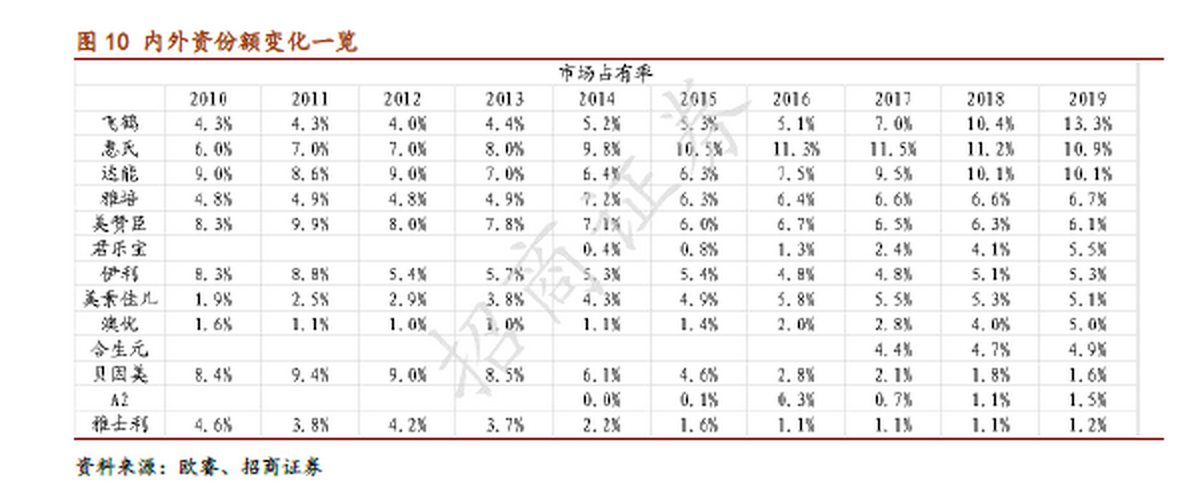 时下,以中国飞鹤外代表的国产乳企“翻身战”已经打响,凭借“更适合中国宝宝体质”进行的产品创新,中国飞鹤年销售量已突破一亿罐,成为中国婴幼儿首选奶。招商证券(18.690, -0.03, -0.16%)出具的调研报告显示,2019年中国飞鹤以13.3%的市场占有率,坐稳行业第一把交椅。