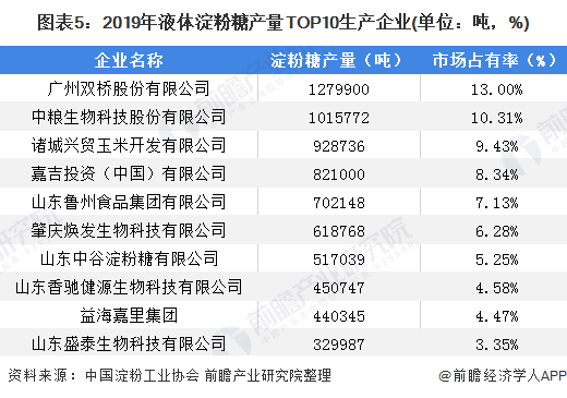 2019年液体淀粉糖产量前十强企业(集团)产量总计710.44万吨,占液体糖总产量的72%。产量前三位的公司(集团)分别为广州双桥、中粮生物科技和诸城兴贸,产量分别为127.99万吨、101.58万吨和92.87万吨,分别占比13.00%、10.31%和9.43%。