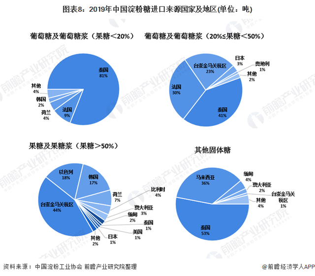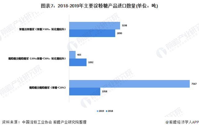 2019年,淀粉糖产品整体进口量17.83万吨,其中葡萄糖及葡萄糖浆(果糖<20%)产品进口量达7,567吨,同比大幅增长286.40%;葡萄糖及葡萄糖浆(20%≤果糖<50%,转化糖除外)进口量403吨,同比大幅下跌63.08%;果糖及果糖浆(果糖>50%,转化糖除外)进口量3,198吨,同比增长10.64%;其他固体糖进口量16.71万吨,同比大幅增长660.47%。