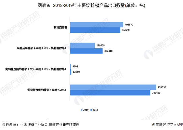 葡萄糖及葡萄糖浆(果糖<20%)2019年出口量79.59万吨,同比增长7.05%。其他固体糖出口量49.26万吨,同比增长5.64%。