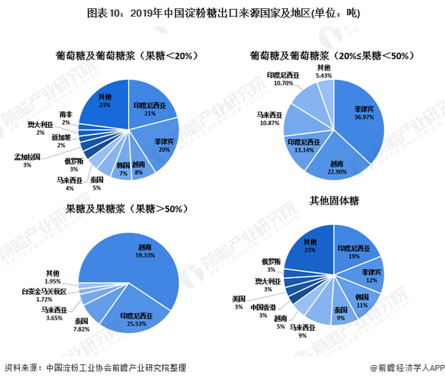 2019年中国葡萄糖及糖浆(20%≤果糖<50%)出口高度集中,以菲律宾、越南、印度尼西亚、马来西亚和印度为主,出口量占比分别36.97%、22.90%、13.14%、10.87%和10.70%,出口量前五的国家占总出口量的94.57%。