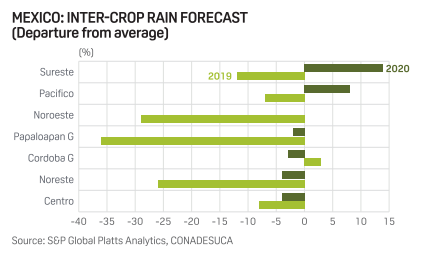 墨西哥只有40%的甘蔗田可灌溉,因此高度依赖降雨——这也在一定程度上解释了为什么2019的极端天气使得该国减产幅度如此之高。过去10年来的面积扩张区域其实都不是很适合甘蔗种植。再加上现有甘蔗品种对于不利天气的耐受程度没有增强。墨西哥国家糖业委员会CONADESUCA对糖厂集中区域未来6个月——尤其是间作期(6-10月)的降水预期与均值持平。藉此,2020-21产量预期为616万吨,依据天气情况上下浮动5%,较上一年度增产17%左右。
