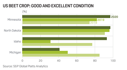 美国甜菜优良率96%,是近三年来最好的数据。2018和2019对应值分别是81%和70%。在路易斯安那,甘蔗的优良率是79%(2018年54%,2019年65%),产量有望恢复13%至820万吨。 图2 美国甜菜优良率