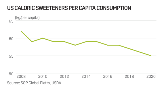 在墨西哥,2020-21的白糖消费预期为下调2%,至440万吨,且不仅仅是几年前趋势的延续。新的标签法规:对于高含糖量的警示,将于今年10月实施。有从业者表示在未来5年内,这可能使白糖消费量减少100万吨——食品制造商为了避免警示标签,会自动调低含糖量。在美国,同期的白糖消费量预期为1110万吨,持平。潜在的减少量依赖于经济表现。 图4 美国人均高热量甜味剂消费