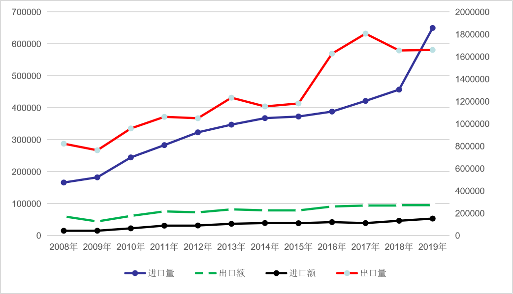 2008年-2019年我国淀粉糖进出口量、进出口额
