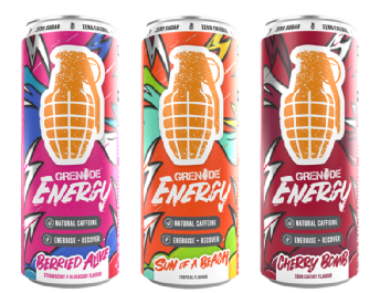 Grenade为其“Grenade”能量饮料系列增加了三种新口味。新口味包括“樱桃炸弹”(酸樱桃)、“沙滩阳光”(热带菠萝、橘子和椰子)和“生莓”(草莓和蓝莓口味)。饮料中使用的咖啡因来自天然咖啡豆,不含防腐剂和人工色素。“Grenade能量”的特点是零糖、零卡路里,含有植物性BCAAs(支链氨基酸),外加电解质和B族维生素。