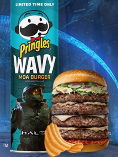 家乐氏品客品牌与Halo合作推出了一种新的Moa汉堡口味薯片,灵感来自游戏世界中的一道菜。该款薯片有“厚重的波浪质感”,融合了多种口味,包括大蒜、甜姜、咸牛肉,辣椒。品客薯片的高级营销总监Gareth Maguire说:“在游戏世界中,halo系列拥有最强大的粉丝基础,所以我们必须创造出一种粉丝之前只能想象的口味——著名的‘Moa汉堡’。”