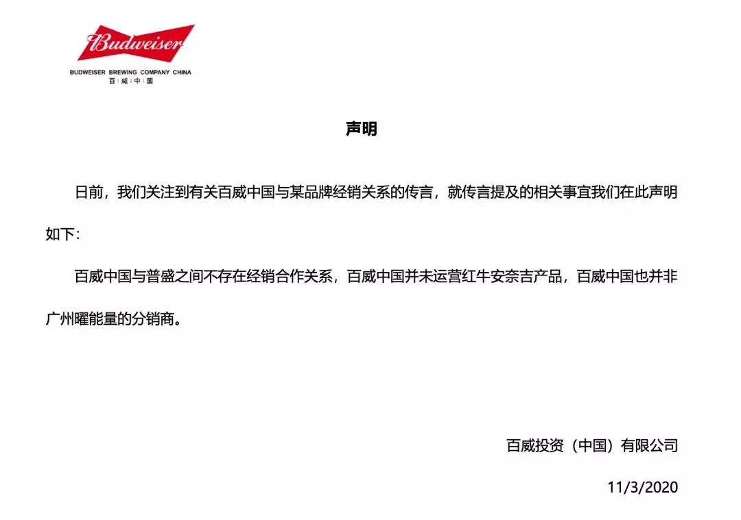 4月18日,百威中国宣布成为奥地利红牛中国大陆的独家代理商。