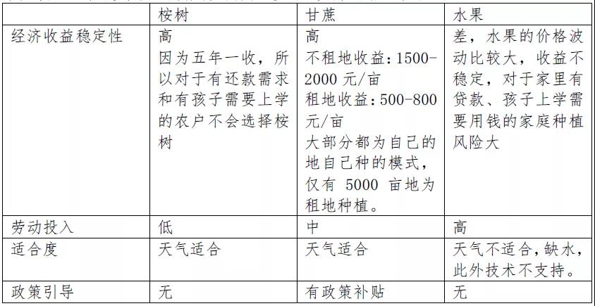 2、 替代作物桉树的收益低于甘蔗,但去年和今年桉树面积均有扩张,分别为2000和1400亩。