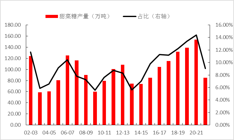 图为国内甜菜产量及占全部产量比重(数据来源:中国糖业协会)