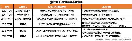 2003年9月商务部、国家发展改革委发布《农产品进口关税配额管理暂行办法》(商务部、国家发展和改革委员会令2003年第4号),其中第三条明确规定我国食糖需实施进口关税配额管理制度,商务部每年9月底出台第二年的食糖进口关税配额申请和分配细则。