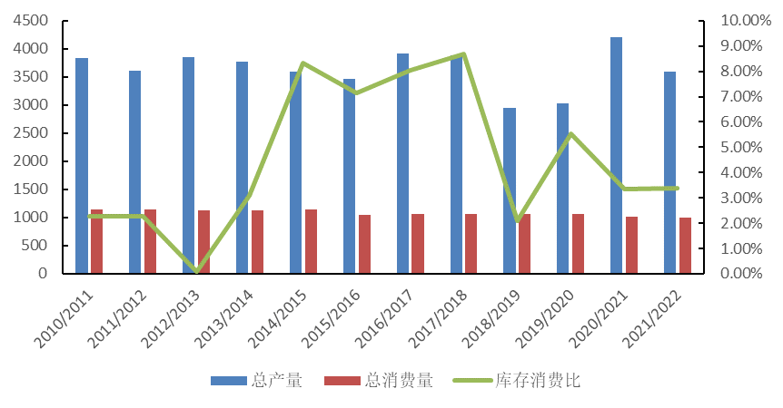 预计2021/22年度食糖消费量1550万吨,保持稳定。考虑到国际市场产需缺口扩大、原油涨价预期增强和市场流动性充裕等因素,本月将2021/22年度国际食糖均价上调至每磅18-21美分;而鉴于国内糖价受到了预期减产、辅料和能源等要素成本增加等因素的支撑,本月将2021/22年度国内糖价上调至每吨5650-6150元。