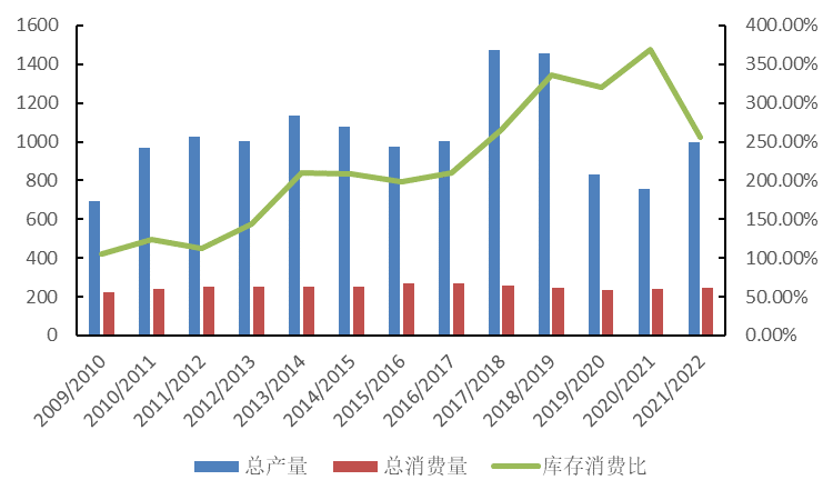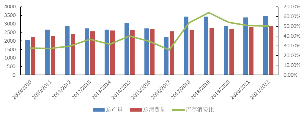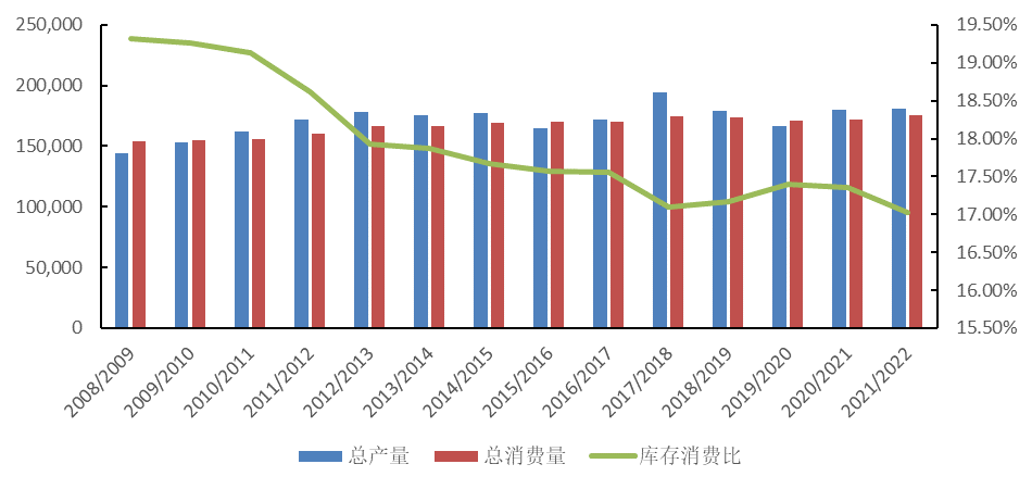 在国际糖市经历了连续三年的供应过剩格局之后,2020/21年度全球食糖面临400万吨的供应缺口。就2021/22年度而言,各大机构对全球供需形势预测不一。国际糖业组织(ISO)最新估计,2021/22年度(10月至9月)全球食糖供需缺口为255万吨。这一数量高于去年8月份预测的385万吨缺口。ISO预计2021/22年度全球糖产量为1.7047亿吨,较此前预估下调18.5万吨,较上年度产量水平小幅增长。巴西预期中的减产有部分被欧盟、俄罗斯和泰国的增产抵消。由于各国出行人数下降、疫情相关限制措施和消费模式的转变等将导致食糖消费量下降,ISO将全球2021/22年度糖消费量预估下调144万吨至1.7303亿吨,虽然该最新的消费量预估仍较上年度水平增加1.2%。ISO还预计2020/21年度全球糖市年末库存为9325万吨,低于上年的9674万吨。目前全球食糖库存消费比为17.02%,处于近十年来的偏低水平,全球糖市供需仍处于紧平衡的格局中。