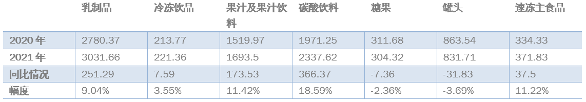 2020年受疫情影响,食糖消费表现相对疲弱,同期含糖食品累计产量基数较低,且一半为负增长。步入2021年后,食糖消费得到一定程度的恢复。从数据来看,2021年国内7类主要含糖食品累计产量除糖果和罐头外,同比均呈现上涨趋势,上涨幅度在3.55%-8.99%之间。其中上涨幅度最多的是碳酸饮料,年产量为2337.62万吨,产量达18.59%;其它品种情况:糖果类年产量304.32万吨,下降2.63%;罐头类年产量831.71万吨,下降3.69%;速冻米面食品类年产量371.83万吨,上涨11.22%;乳品类年产量3031.66万吨,上涨9.04%;冷冻饮品类年产量221.36万吨,上涨3.55%;果蔬汁饮料类年产量1693.5万吨,上涨11.42%。