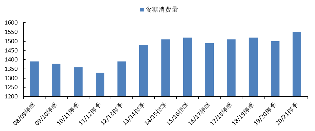 人口规模和城镇化水平的提升为食糖消费的增加提供了基本支撑,同时在国家卫生健康委发布的《健康中国行动(2019-2030)》文件中指出,政府要加快研究制定标准限制高糖产品的生产销售。加大宣传力度,推动低糖或无糖食品的生产与销售。随着减糖风潮的兴起,零糖、零脂、零卡正成为时下消费者流行的新选择。在此背景下,2020/21榨季全国食糖总消费量1550万吨,小幅提升50万吨,呈现出稳中缓慢增长的趋势。随着疫情影响减弱,经济形势向好,预计2021/22榨季国内食糖消费将保持在1550万吨的水平。