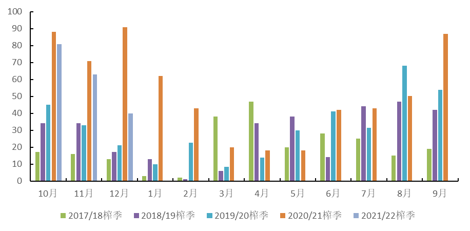 自2020年5月22日开始,食糖保障关税措施到期,配额外进口关税降低至50%,内外糖价的联动性有所增强。在食糖进口政策调整和国内外价差等因素的综合影响下,2020/21年度企业进口的积极性超出市场预期。回顾2021年食糖进口量的变化,3-5月的食糖进口量处于相对低位,给国产糖腾出了较好的销售窗口。一方面是由于在这几个月里,国内处在新糖累库存时段,配额发放进度较慢,进口糖A配额和B配额,拖到2021年5月份才发放;另一方面是由于进口利润下滑及中国保税库有大量进口糖堆积,因此中国在二季度减少了海外采购量。步入6月后,食糖进口量重拾升势。受国内外价差较大影响,食糖进口保持较高水平。20/21榨季中国累计进口食糖633万吨,同比增加258万吨。创下近5个榨季以来食糖进口的最高历史记录。步入2021/22榨季后,10-12月中国累计进口食糖174万吨,同比减少76万吨。2021年中国累计进口食糖567万吨,同比增加40万吨。从价差看,截至2021月12月31日,南宁主产区的现货报价为5660元/吨,泰国糖配额内的加工成本已达到4777元/吨,巴西配额内的加工成本达4720元/吨。配额内内外糖之间的价差分别为883元/吨、940元/吨。泰国糖配额外的加工成本已达到6078元/吨,巴西配额外的加工成本达6005元/吨。配额外内外糖之间的价差分别为-418元/吨、-345元/吨。基于进口利润的情况,2021年8月至12月多数时间处于关闭状态。中国2021/22榨季的商业买船进度较慢,商业进口预期有待实现。