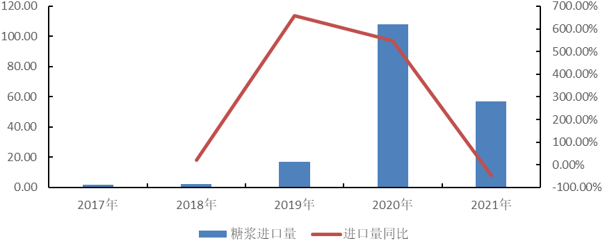 图4-2:我国糖浆进口量情况 单位:万吨、%