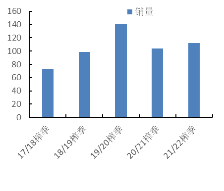 就12月单月销量而言,销糖量达到111.85万吨,同比增加8.18万吨。从近5个榨季12月销量来看,最高值为19/20榨季的140.96万吨,最低值为17/18榨季的73.61万吨,近5个榨季平均值为105.76万吨。本榨季12月销糖量高于历史均值。