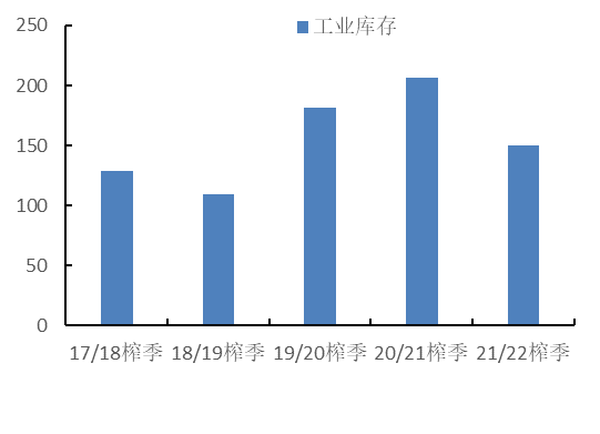 工业库存方面,截至12月底,2021/22榨季国内糖厂新增工业库存为149.86万吨,同比减少56.46万吨。从近5个榨季截至12月底的工业库存来看,最高值为20/21榨季的206.32万吨,最低值为18/19榨季的109.27万吨,近5个榨季的平均值为155.17万吨。2020/21榨季截至12月底的工业库存低于历史均值水平。