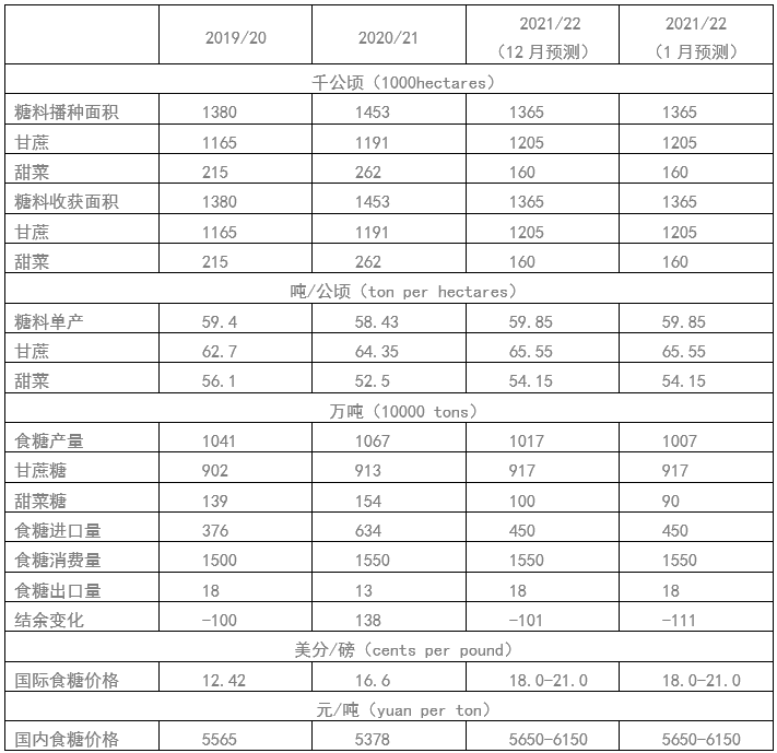 2021/22年度中国糖料种植面积1365千公顷,比上年度减少88千公顷(97.5万亩),其中北方甜菜种植比较效益下降,面积减少102千公顷,但南方甘蔗种植收益有所改善,蔗农生产积极性提高,面积略有增加;预计2021/22年度食糖产量1007万吨,比上年度减少60万吨。