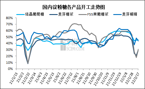 本周淀粉糖企业开工负荷陆续恢复,除麦芽糊精开工负荷降低外,淀粉糖其它产品开工负荷均有增加。截止到2月17日国内淀粉糖行业本周开工负荷率为36.40%,环比上周增加7.22个百分点。具体分品种来看:截止到2月17日,本周国内结晶葡萄糖开工负荷率为45.53%,环比上周增加0.44个百分点。整体来看由于节后结晶葡萄糖下游需求疲软,导致主要企业开工负荷恢复速度缓慢,市场交投活动一般,部分企业库存压力较大,开工积极性不高。本周麦芽糖浆开工负荷率为29.65%,环比上周增加8.77个百分点。目前上游多数生产企业陆续恢复生产,但考虑到节后市场下游需求启动缓慢,部分工厂复产后仍处于低负荷生产状态,导致行业整体开工提升偏慢。本周F55果葡糖浆开工负荷率为30.62%,环比上周增加12.99个百分点。近期随着下游大型终端企业复产,上游工厂有部分前期合同订单执行,库存得到一定消耗,企业相继恢复生产,行业整体开工提升。本周麦芽糊精开机负荷率为43.67%,环比上周减少4.73个百分点,个别企业出现停产和减产情况,导致麦芽糊精整体开工负荷下滑。