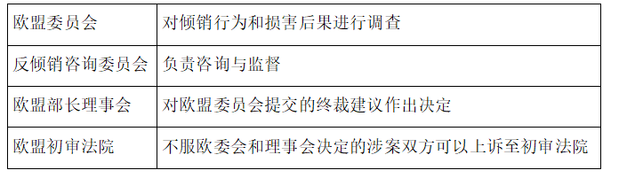 欧盟在处理反倾销实务时以调查机构、监督机构和决定机构组成,并有一个救济机构。