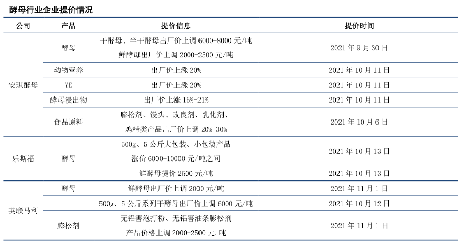 由于糖蜜价格、海运费、能源等成本上涨压力较大,2021年10月起公司国内B端酵母及部分衍生物产品出厂价提价约20%+,同时国外酵母产品去年也经历了多轮产品提价,累计提价幅度约20%。