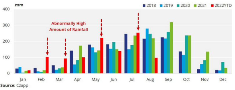 在旅行之前,我们预计由于整个泰国,尤其是在北部和东部地区的累积降雨量很高,因此今年的甘蔗农业产量将表现良好。到目前为止,泰国的降雨量为1031毫米(同比增长21.2%)。