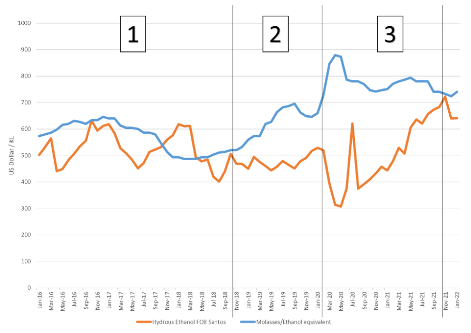 这一时期由新冠病毒主导。在2020年疫情大流行开始时,大多数大宗商品价格暴跌。我们短暂地看到美国油价为负,布伦特原油跌至20美元/桶以下。之后,我们看到石油和酒精价格回升,这使糖蜜和酒精价格回到平价水平。