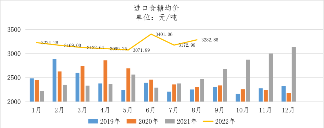 8月进口食糖月度均价为3282.85元/吨,同比上涨812.18元/吨,涨幅达32.87%。