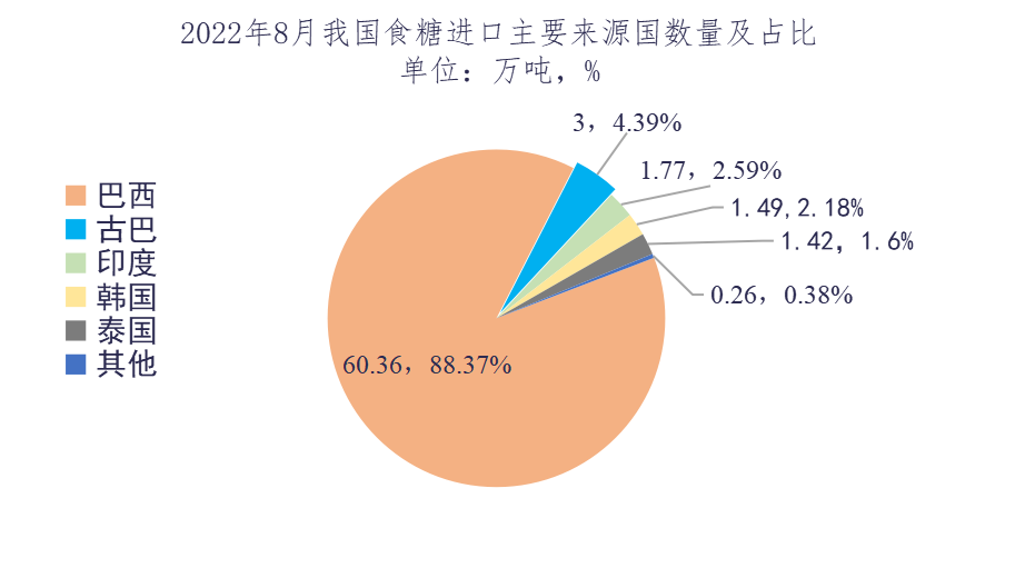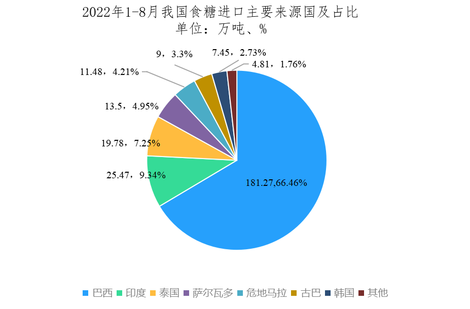 2022年1-8月,我国主要食糖进口来源国为巴西,具体情况为巴西(181.27万吨,占比66.46%)、印度(25.47万吨,占比9.34%)、泰国(19.78万吨,占比7.25%)、萨尔瓦多(13.5万吨,占比4.95%)、危地马拉(11.48万吨,占比4.21%)、古巴(9万吨,占比3.3%)、韩国(7.45万吨,占比4.41%)。
