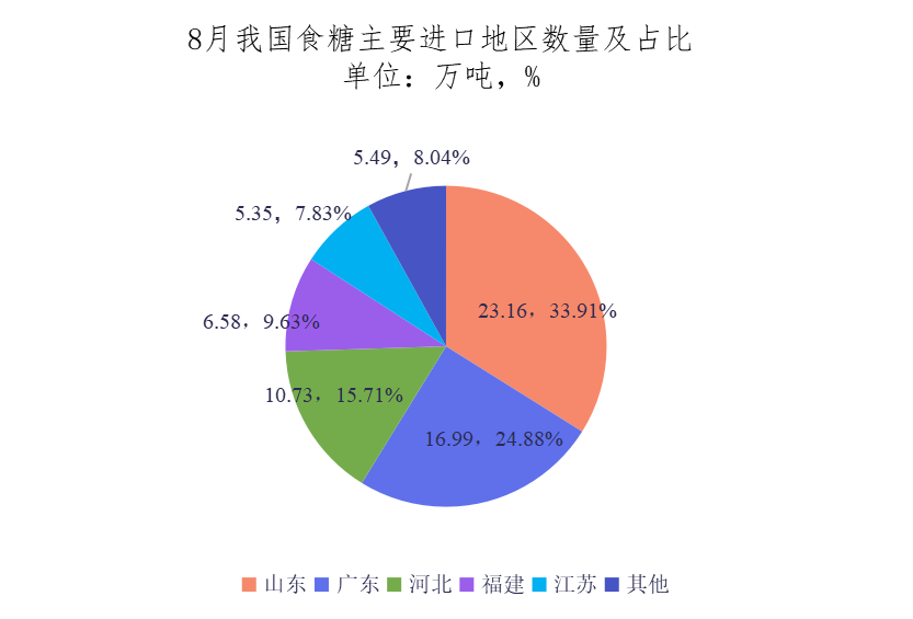 8月,我国食糖进口前五大省市为山东(23.16万吨,占比33.91%)、广东(16.99万吨,占比24.88%)、河北(10.73万吨,占比15.71%)、福建(6.58万吨,占比9.63%)、江苏(5.35万吨,占比8.04%)。