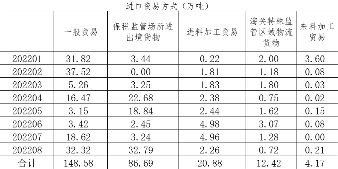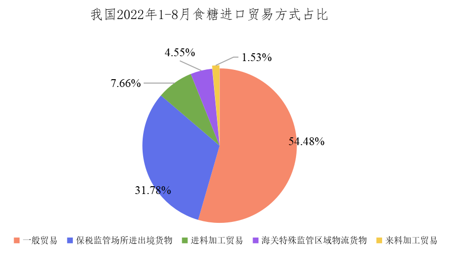 2022年1-8月,我国进口食糖贸易方式以一般贸易(148.58万吨,占比54.48%)为主,其次为保税监管场所进出境货物(86.69万吨,占比31.78%),具体贸易方式占比如下:
