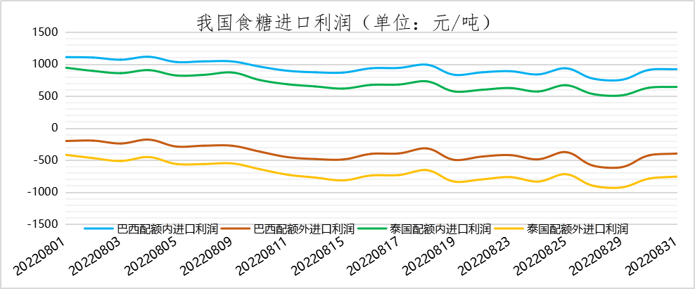 8月进口估算利润呈小幅波动,巴西配额内食糖进口估算利润区间为753~1114元/吨,配额外食糖进口估算利润区间为-613~-181元/吨;泰国配额内食糖进口估算利润区间为510~994元/吨,配额外食糖进口估算利润区间为-929~-419元/吨。