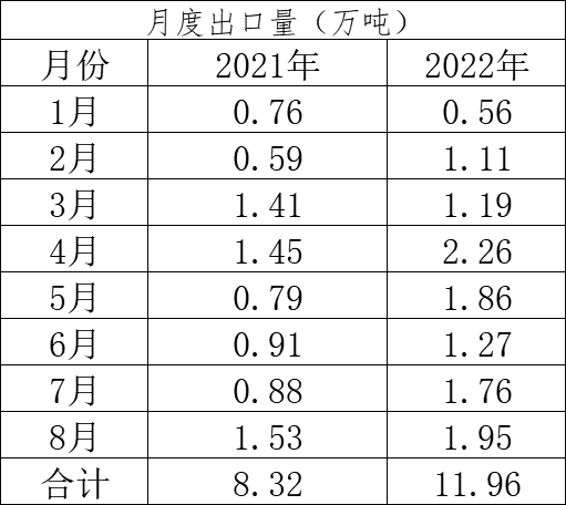8月,我国出口食糖1.95万吨,同比增加0.42万吨;2022年1-8月,累计出口食糖11.96万吨,同比增加3.64万吨。