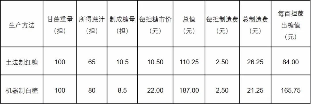 《中国近代手工业史料》记载了二十世纪30年代“中国土法制红糖与新式机器制白糖效益比较”的数据[5]。