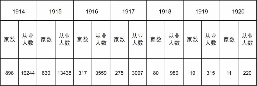民国初年的农商部对1914-1920年全国的糖业生产情况作了一次调查,糖坊与做糖业人员的情况如下表:
