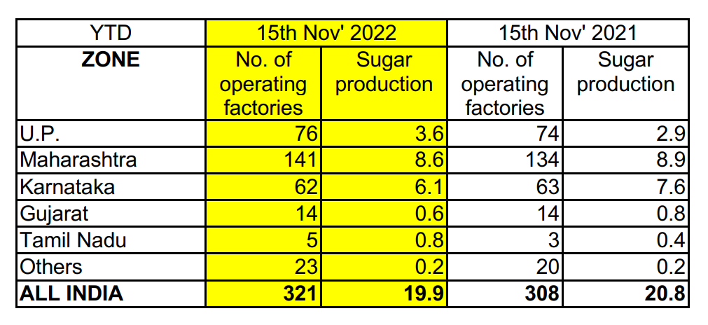 图:印度2022/23榨季截至11月15日的食糖产糖量