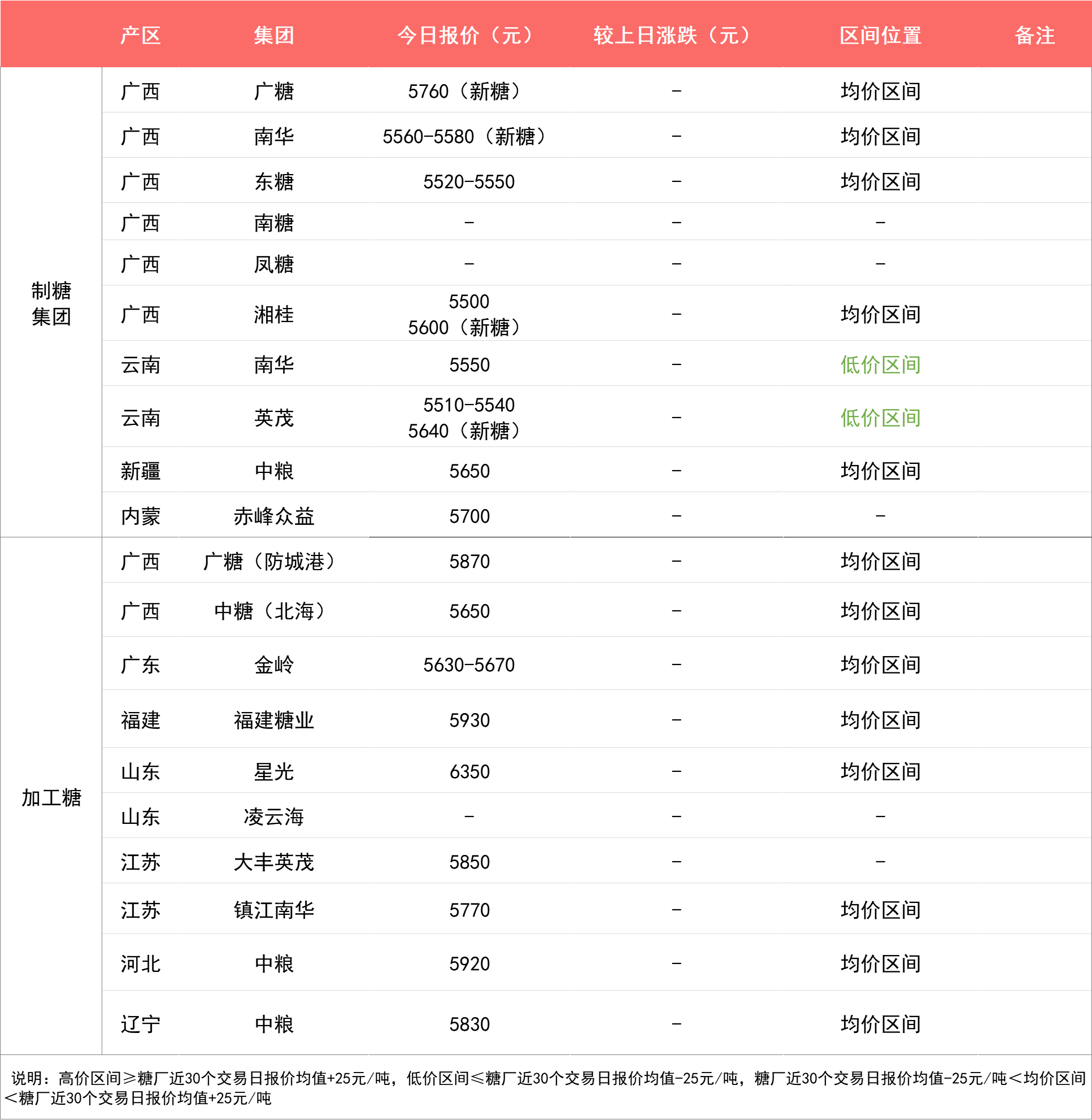 今日广西白糖现货成交价为5512元/吨,下跌4元/吨;产区制糖集团陈糖报价5500-5550元/吨,新糖报价区间为5560-5760元/吨;加工糖厂主流报价区间为5650-5930元/吨。糖企现货报价持稳,新糖供给逐步增加,整体成交偏淡。