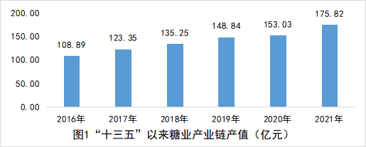 全区糖产业主要附加值产品产值与食糖产值之比已超过50%,比“十三五”初期的2016年提高约10个百分点(见图2)。