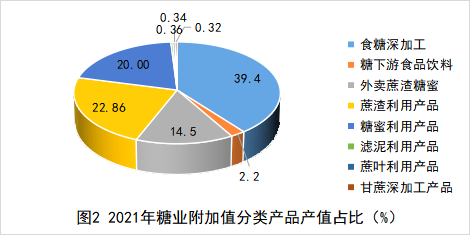 2021年,全区糖产业主要附加值产品实现产值175.82亿元,比2016年增长61.46%(见图1)。其中:食糖深加工产值69.27亿元,占39.4%;蔗渣利用产品产值40.19亿元,占22.86%;糖蜜利用产品产值35.17亿元,占20%;外卖蔗渣和糖蜜产值25.54亿元,占14.5%;食糖下游产品产值3.86亿元,占3.86%;滤泥利用、蔗叶利用、甘蔗深加工等产品分别实现产值0.62亿元、0.61亿元、0.56亿元,占比均为0.34%左右。