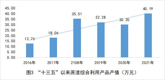 广西蔗渣产量约1150万吨/年,已实现100%的利用。2021年,全区蔗渣综合利用产值40.19亿元,比2016年的12.76亿元增长2.15倍(见图3)。