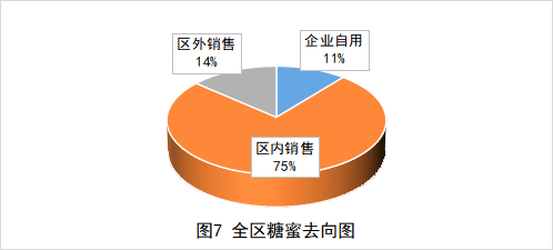 糖蜜销售分为制糖企业自用、区内销售和区外销售三部分。以2019/20榨季数据为例,据不完全统计,广糖集团、凤糖生化、湘桂糖业3家糖企自留糖蜜17.52万吨,占糖蜜总量约11%;区内糖蜜销售数量为120.38万吨,占比75%;剩余21.9万吨糖蜜销往区外,占比约14%(见图7)。