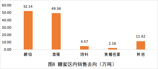 区内销售糖蜜主要去向是用于生产酵母、酒精、饲料、焦糖色素、调味品等,其中用于生产酵母的糖蜜达到52.14万吨,超过用于生产酒精的糖蜜用量(见图8)。
