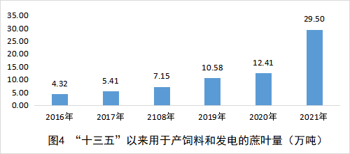 广西蔗叶数量约700万吨/年。“十三五”初期,蔗叶综合利用水平很低,年利用量不到4万吨。近年来,秸秆禁烧政策和蔗叶利用技术水平的提高有效提升了蔗叶利用率,全区2021年的蔗叶利用率约30%,比2016年提高约25个百分点(见图4)。
