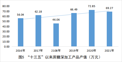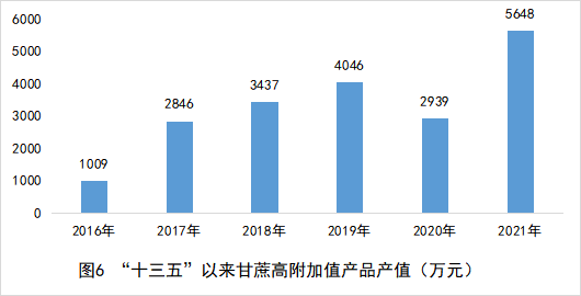 “十三五”时期以来,以甘蔗为原料生产甘蔗醋、甘蔗浓缩汁、甘蔗酒、甘蔗饮料等产品相继研发成功,并快速产业化。2021年,全区实现工业总产值5648万元,比2016年的1009万元增长了4.6倍,甘蔗迈进高值化利用轨道(见图6)。