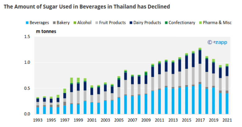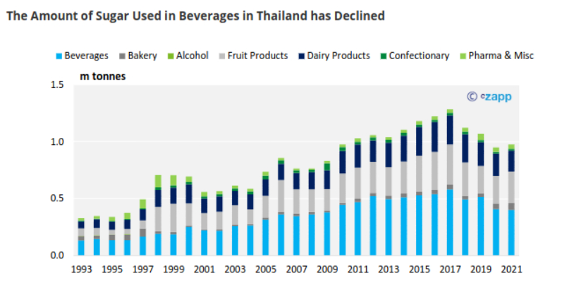 Cz估计了泰国每年的食糖消耗量。为此,我们在对当地糖产量的预测中扣除了出口,增加了进口。我们认为泰国糖消费量在2016年达到每人每年38公斤的峰值,此后一直在下降。有趣的是,这种下降的开始恰逢泰国引入糖税。美国农业部每年都会报告来自泰国甘蔗和糖业委员会办公室的数据,概述泰国每年工业上使用的糖量。饮料行业使用的糖在2017年达到58.2万吨的峰值,到2021年已降至40.3万吨。