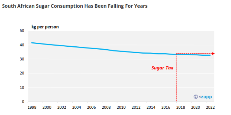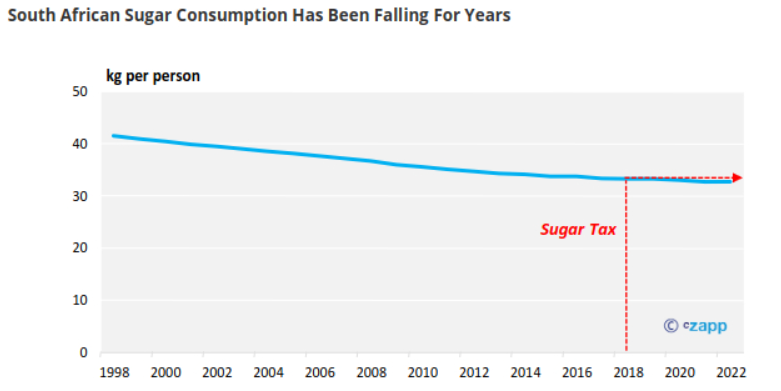 2018年,南非实施了健康促进税,对每100毫升添加热量甜味剂超过4克的饮料征收每克0.021南非兰特的糖税,不包括果汁。然后在2019年提高到每克糖0.0221扎尔。