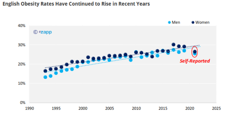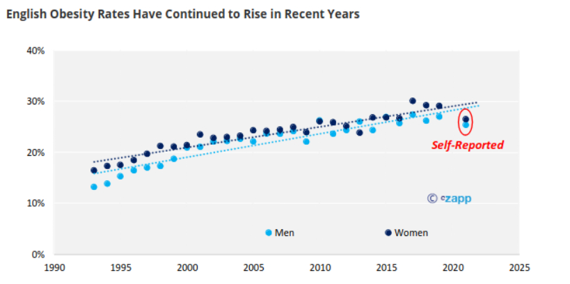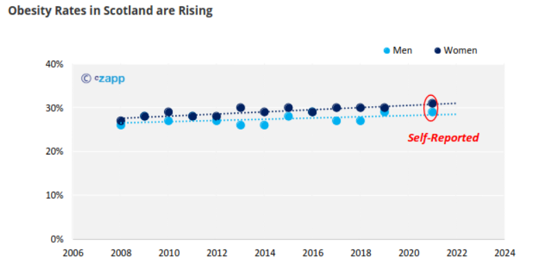 我们担心过于重视2021年的统计数据,因为它们是个人自己上报的,而不是医生测量的。时间将会证明这些数据有多可靠,以及英国的肥胖率是否已经最终稳定下来。这些趋势也反映在英国其他地区。例如,在苏格兰,肥胖率也在持续上升。