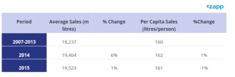 与墨西哥一样,下降的开始始于糖税和标签法规出台之前。同样,与墨西哥一样,近年来下降速度似乎有所上升。我们无法说出其中有多少是由于新法规的引入。